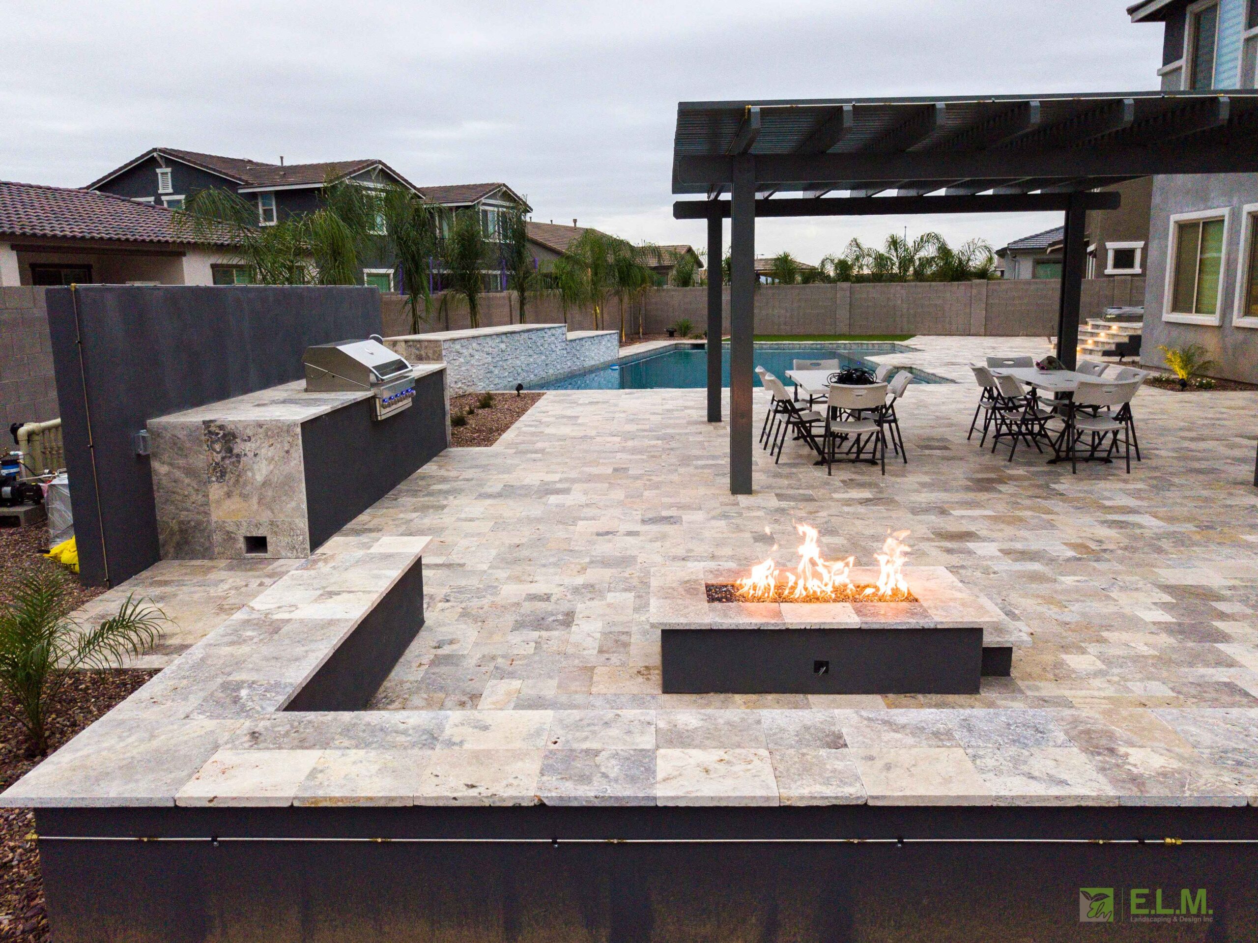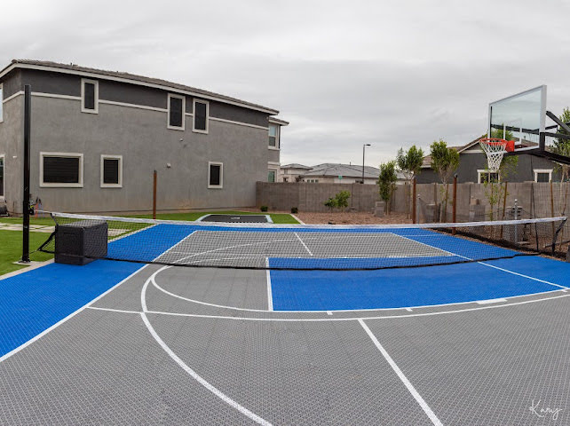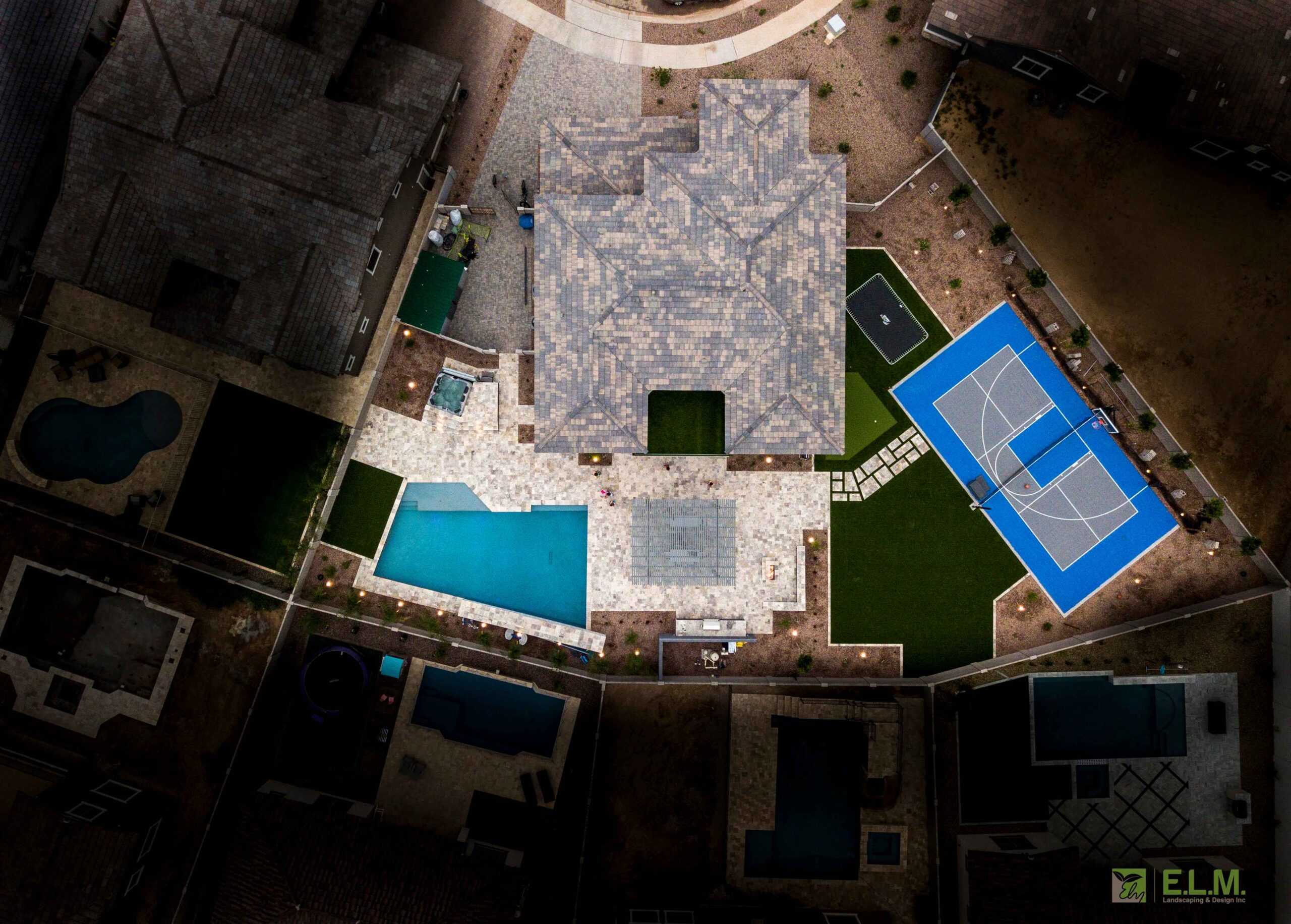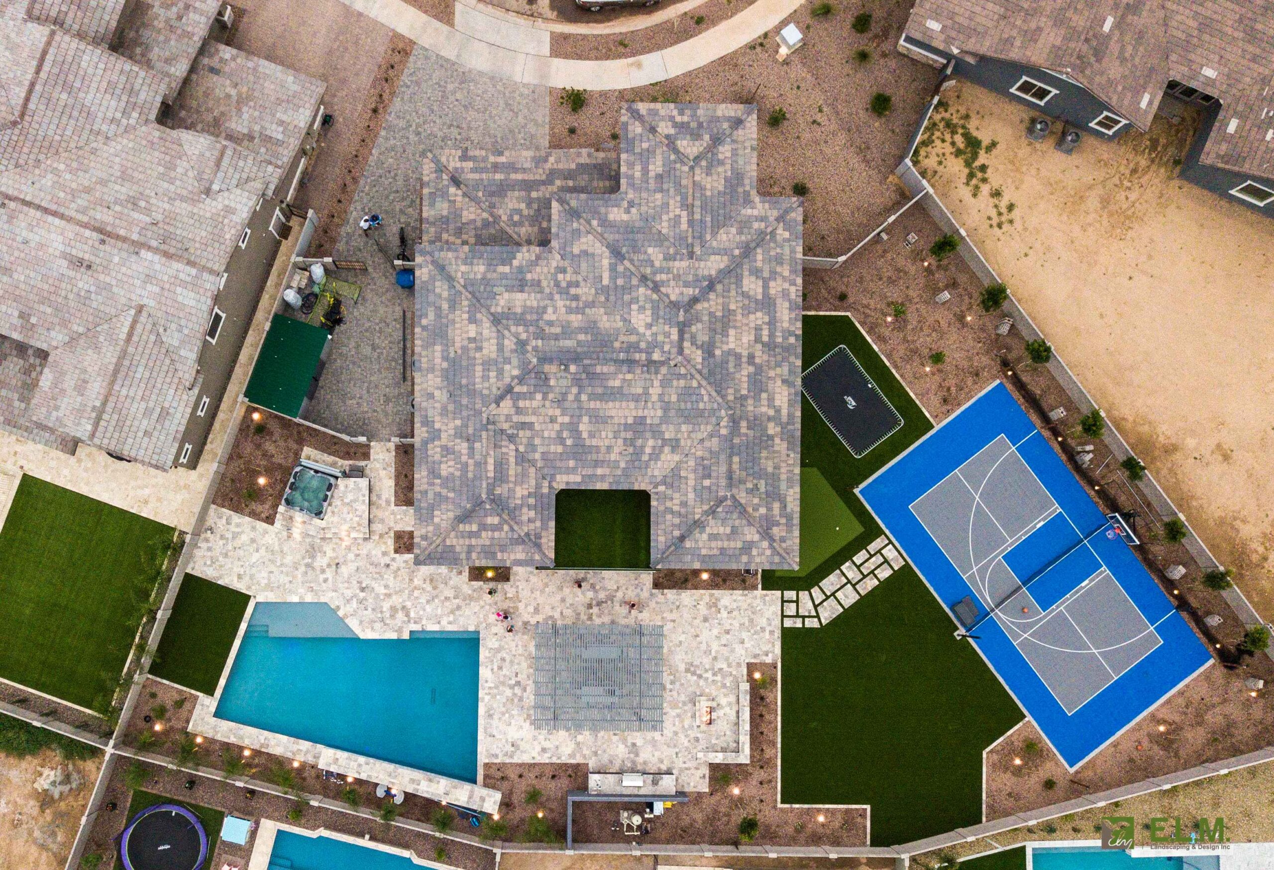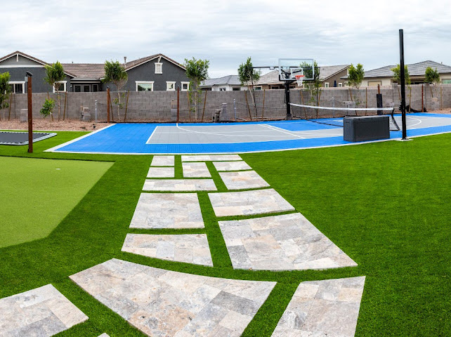 At the Mendoza residence, the landscaping was designed with family connection and teen friendly entertainment in mind. With active teenagers in the home, the family wanted a multifunctional outdoor living space where their kids could invite friends over and enjoy time together in a safe stylish environment and host large family gatherings. The design includes a sports court, in-ground trampoline, putting green, and jacuzzi; creating a fun, active space that keeps everyone engaged. Features like the fire pit and built in barbeque along with the pergola covered patio, outdoor shower, and integrated sound system make it ideal for both casual hangouts and larger gatherings. This yard isn’t just a backyard, it’s a destination for relaxation, recreation, and lasting memories.