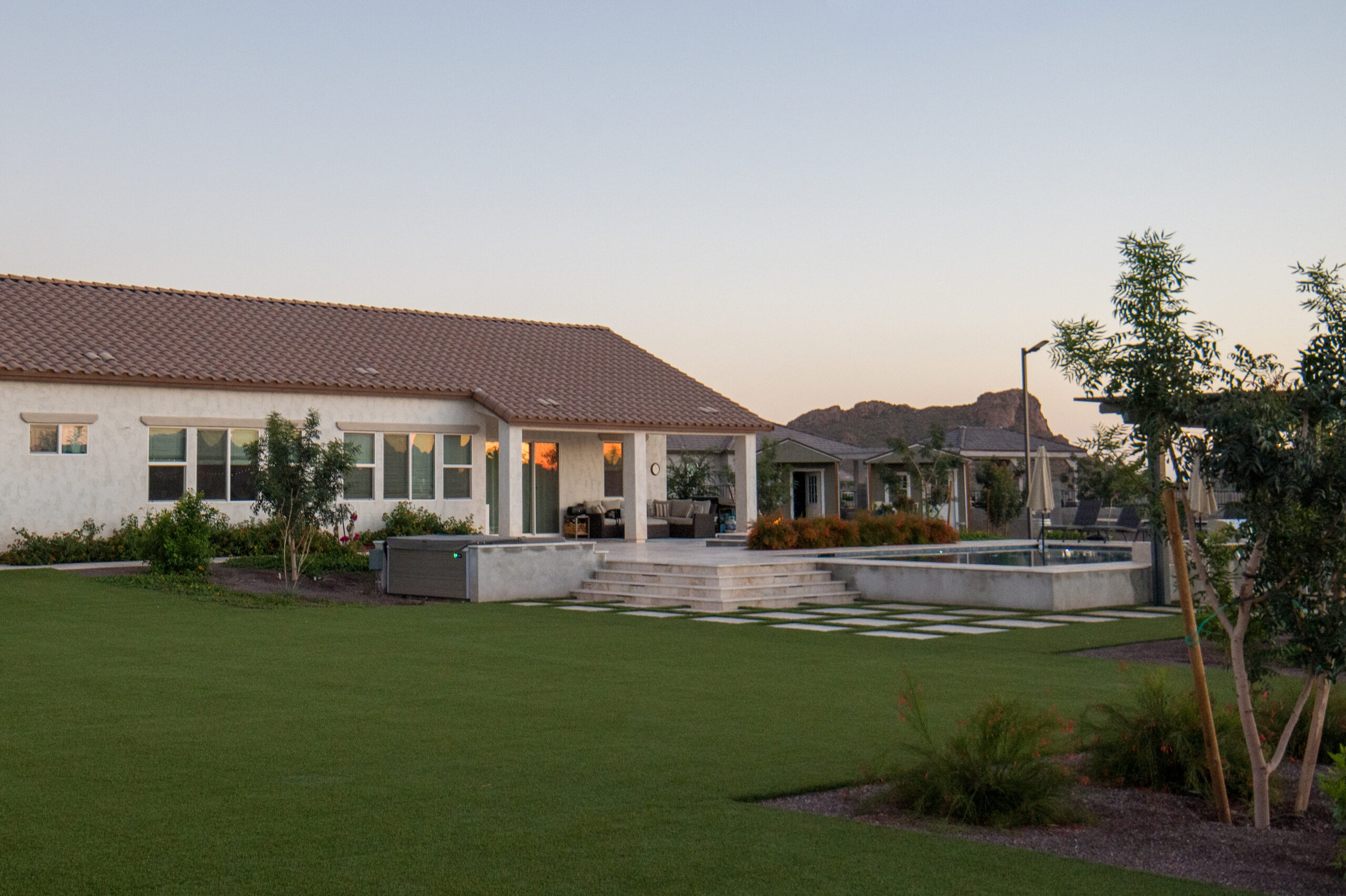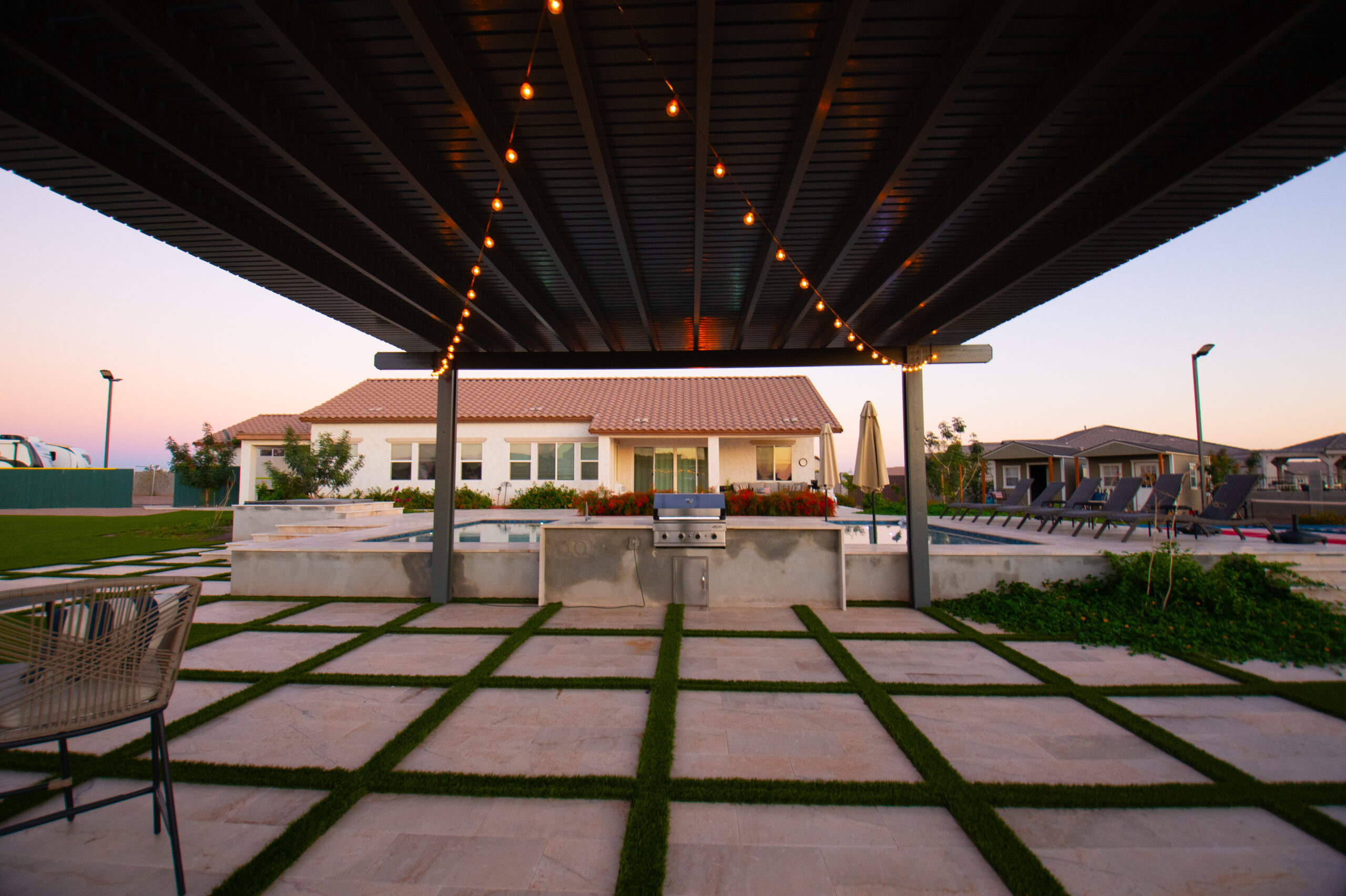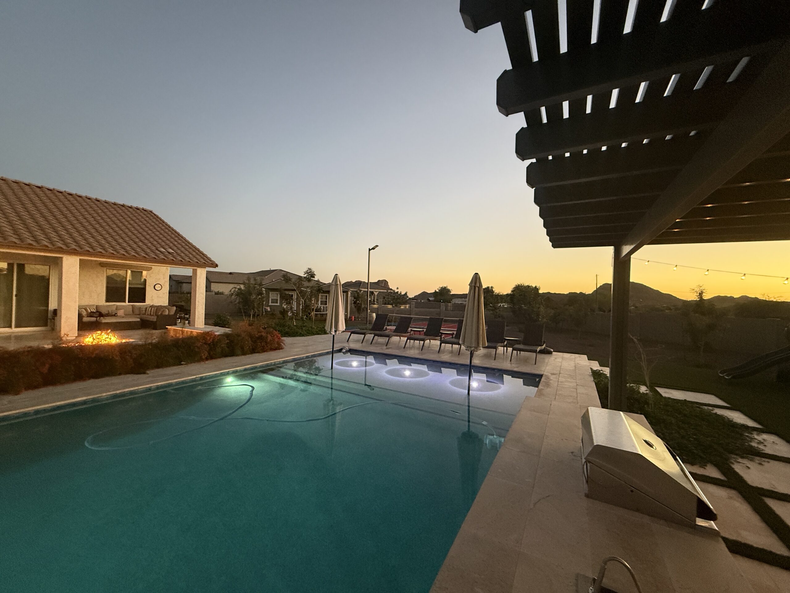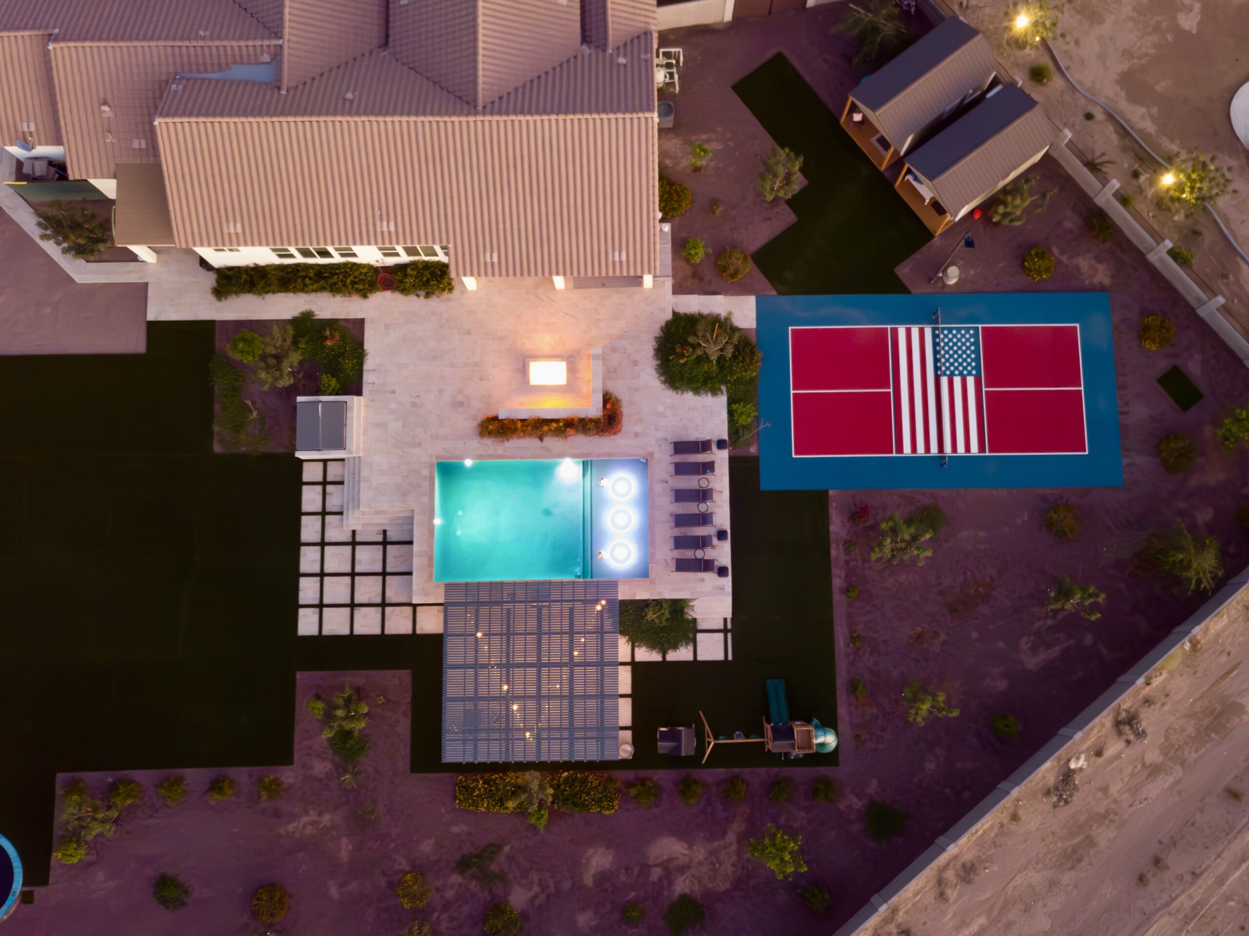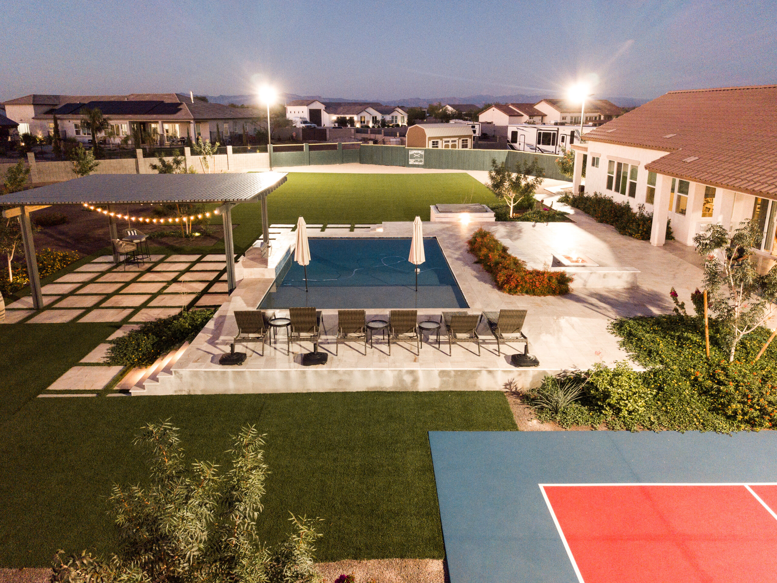 At the Lamb residence, the landscape was designed with one main goal in mind: creating the ultimate space for hosting. As a public figure who frequently brings people together, the homeowner needed a yard that could handle large-scale events while still feeling warm and welcoming for family time. The result is an expansive, resort style outdoor space perfect for entertaining family and the community. From the pool, hot tub, and outdoor kitchen to the pickleball court, wiffleball field, and spacious pergola, every element was built with gatherings in mind. A fire pit and layered lighting create the perfect ambiance for evening events, while the trampoline and open turf areas keep things fun for grandkids and adults alike. The Lambs now enjoy a yard that balances elegance, entertainments, and everyday family connection; all in a space that’s always ready for a crowd.